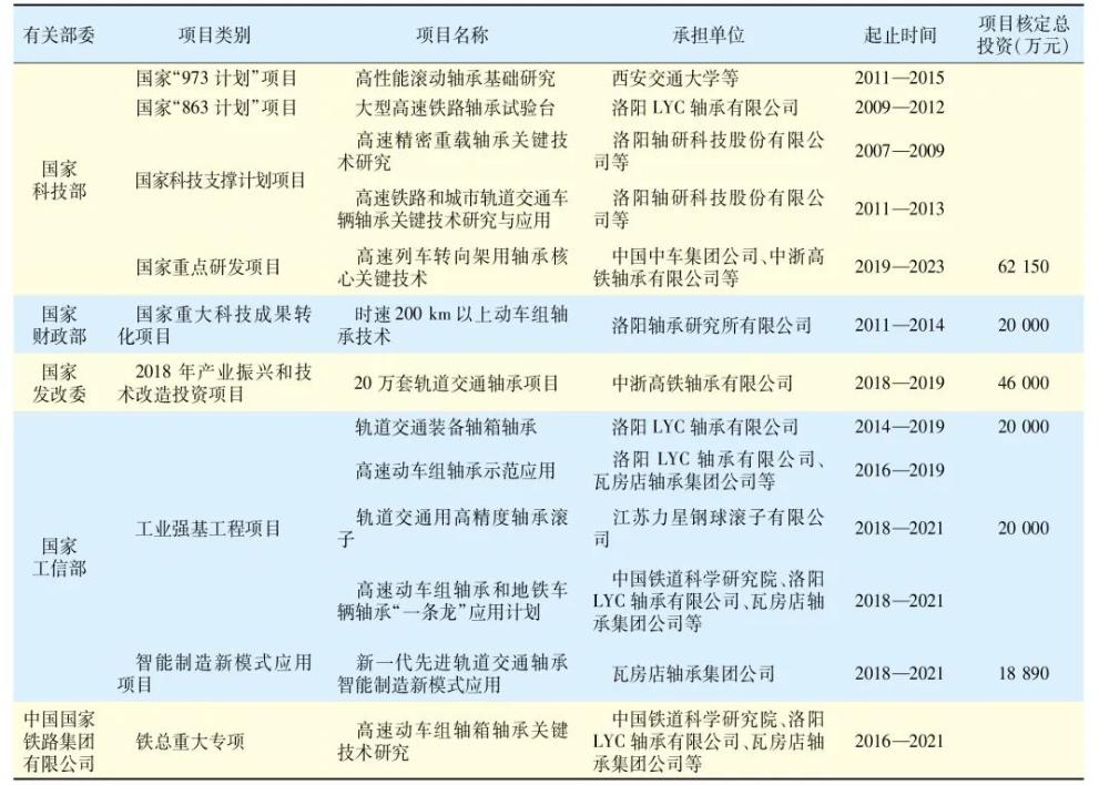 高速鐵路是戰(zhàn)略性新興產業(yè),是制造強國戰(zhàn)略的重點領域。國產高速動車組及配套軸承的開發(fā)應用引起了國家有關部委的高度重視和社會各界的廣泛關注。十多年來,國家有關部委實施了一系列支持國產高速動車組軸承開發(fā)應用的政策項目,見表5(據(jù)不完全統(tǒng)計,這些項目核定總投資近19億元)。