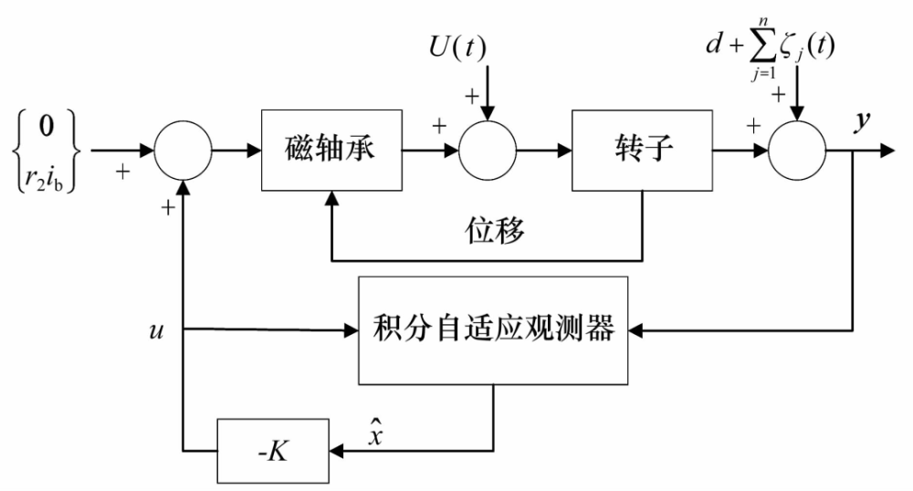 另外,文獻(xiàn)[26]提出了一種基于頻域自適應(yīng)LMS算法的諧波振動(dòng)抑制方法,對每個(gè)權(quán)值設(shè)置相應(yīng)的步長并實(shí)時(shí)調(diào)整,在保證穩(wěn)態(tài)精度的同時(shí)提高了收斂速度。文獻(xiàn)[27]提出了一種新的積分自適應(yīng)觀測器(圖9),用于識(shí)別傳感器誤差的直流和諧波含量并同時(shí)估計(jì)系統(tǒng)狀態(tài),試驗(yàn)表明當(dāng)系統(tǒng)同時(shí)受到測量誤差和不平衡干擾時(shí)能有效減小位移和電流幅值。文獻(xiàn)[28]提出了一種針對低次主導(dǎo)諧波的通用選擇分?jǐn)?shù)階重復(fù)控制方法,實(shí)現(xiàn)了任意轉(zhuǎn)速下快速高精度的諧波電流抑制。
