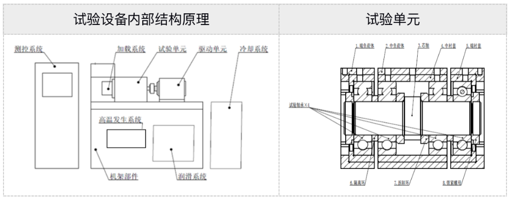 試驗(yàn)機(jī)結(jié)構(gòu)原理圖,包含機(jī)架部件、試驗(yàn)單元、驅(qū)動(dòng)系統(tǒng)、徑向加載系統(tǒng)、軸向加載系統(tǒng)、潤(rùn)滑系統(tǒng)、冷卻系統(tǒng)、高溫發(fā)生系統(tǒng)、測(cè)控系統(tǒng)等部件組成。